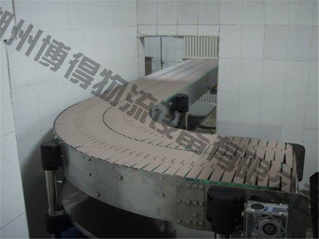 鏈板輸送機(jī)以標(biāo)準(zhǔn)鏈板為承載面,由馬達(dá)減速機(jī)為動力傳動;我們可以通過多列鏈板并行,使鏈板輸送機(jī)做的很寬并形成差速,利用多列鏈板的速度差使多列輸送在無擠壓的情況下變?yōu)閱瘟休斔?,從而滿足飲料貼標(biāo)、灌裝、清洗等設(shè)備的單列輸送的要求,我們可以將兩條鏈板輸送機(jī)的頭尾部做成重疊式的混合鏈?zhǔn)沟闷浚ü蓿w處于動態(tài)過度狀態(tài),使輸送線上不滯留物料,可以滿足空瓶以及實瓶壓力和無壓力輸送。